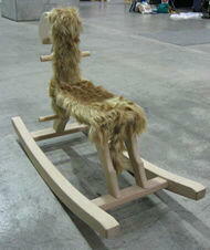 初の子供向け作品の作品です。口が動いて尾を振ることができます。そして金玉ついています。その金玉が尾を揺らし、座面の裏にぶつかってコンコン音を鳴らせます。静かに木馬を揺らせて乗って遊ぶのが普通ですが、この作品は音を鳴らせることが特徴です。simizzy 2004